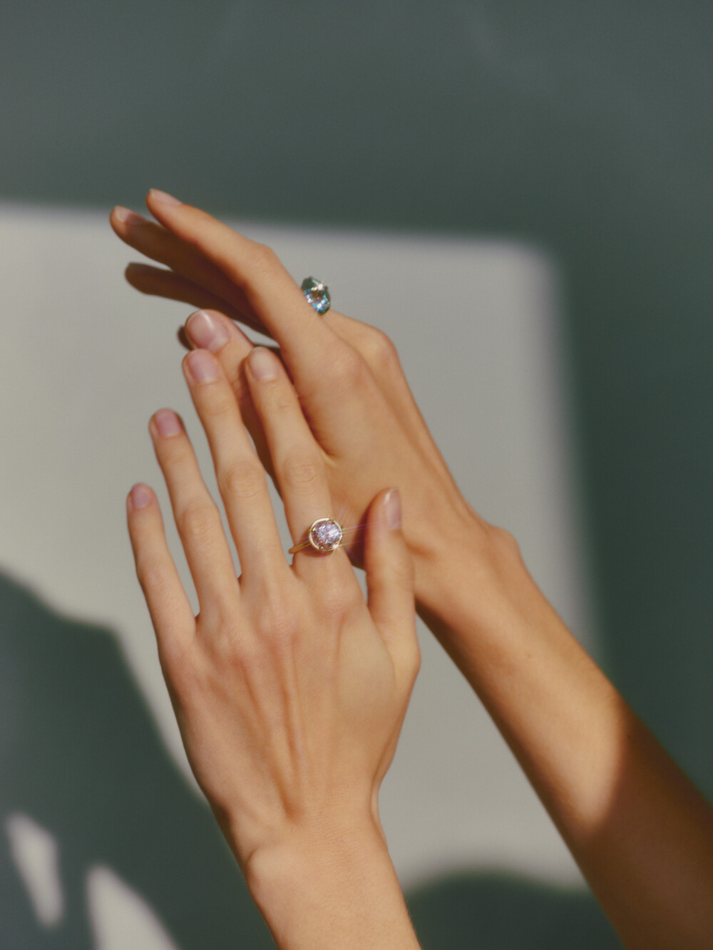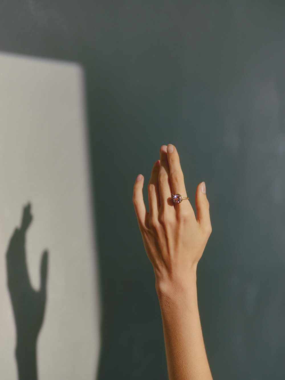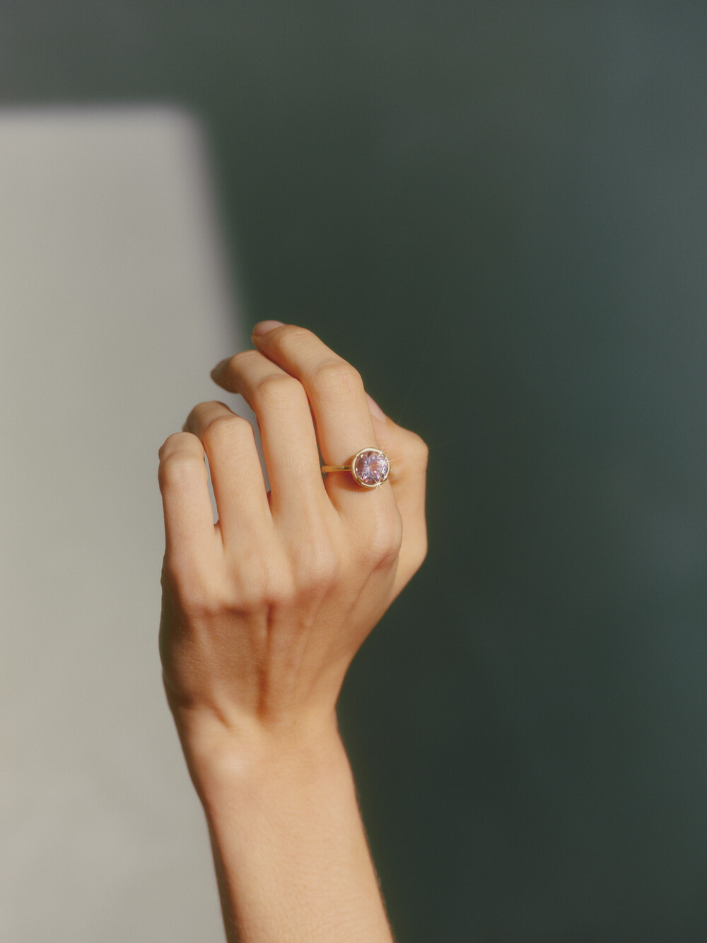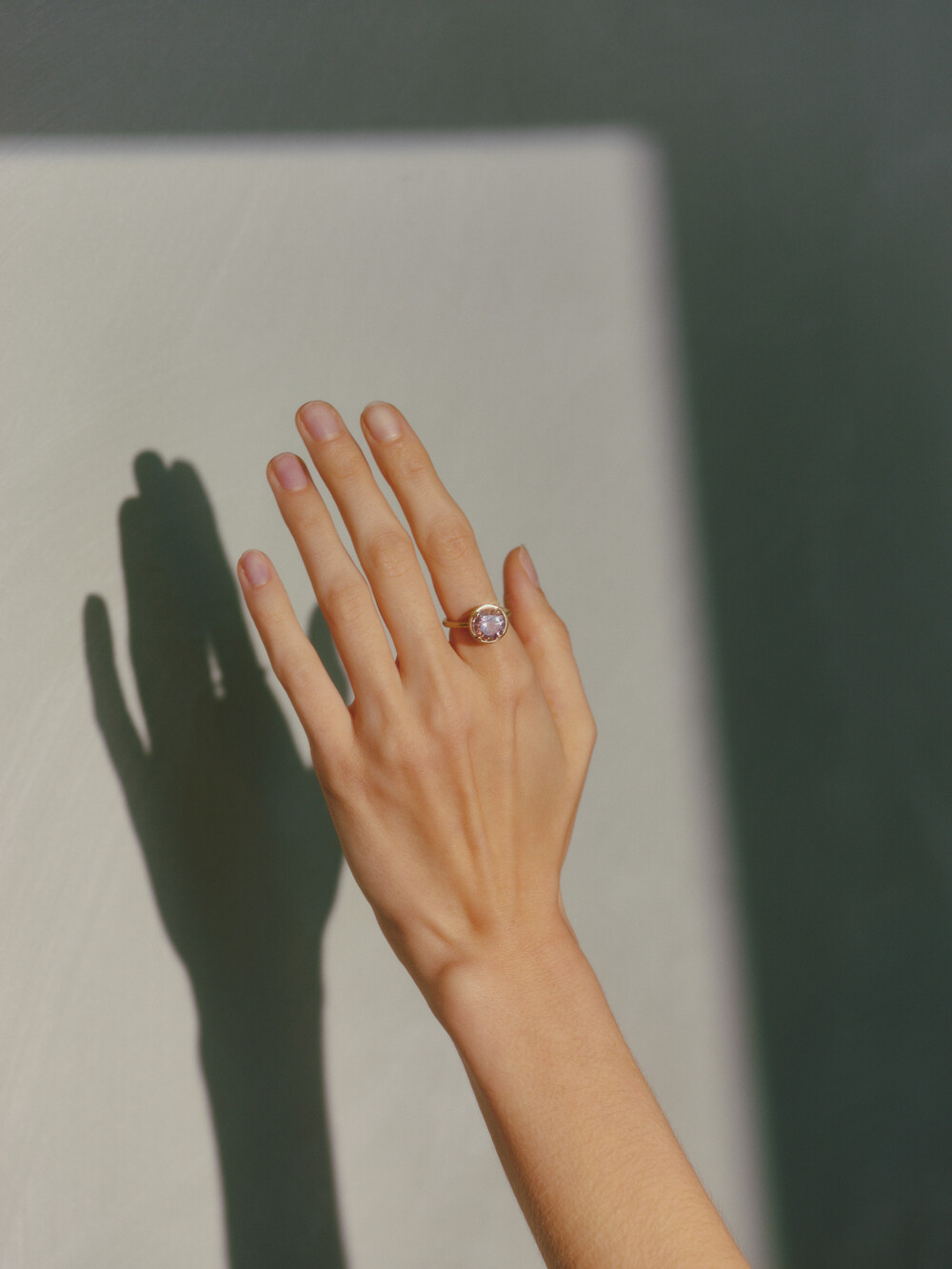 It is a ring where comfort and purity coexist. A candy-shaped round amethyst ring that evokes childhood memories.