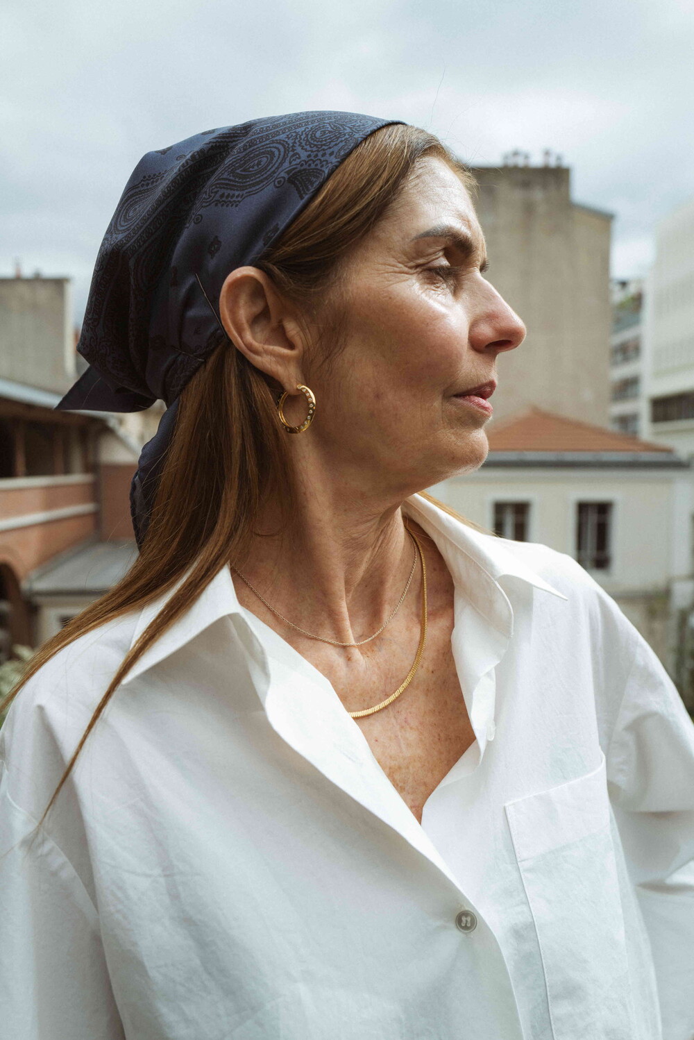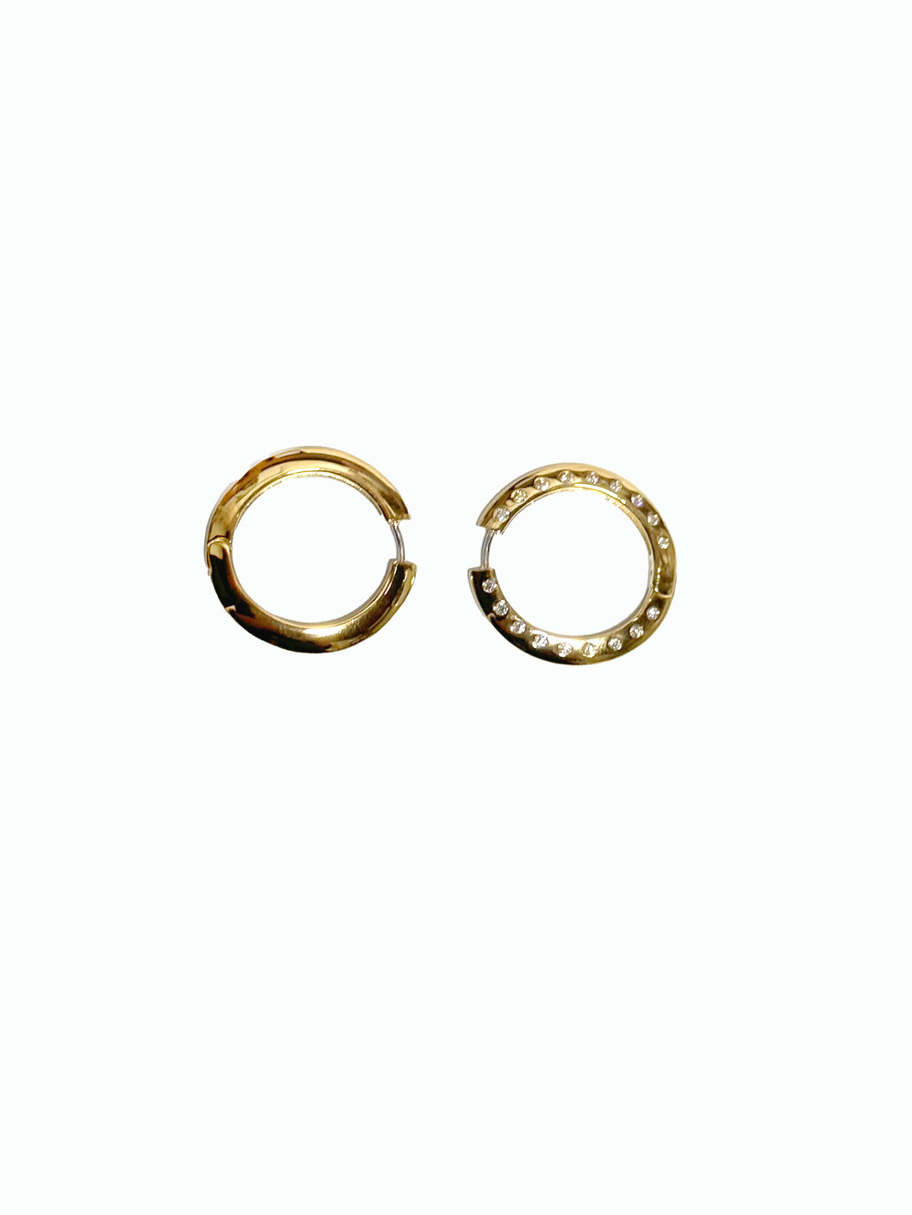 This earring features a stone fragment set on one side, making it reversible for versatile wear. It's lightweight due to its hollow design and secures with a one-touch clasp.