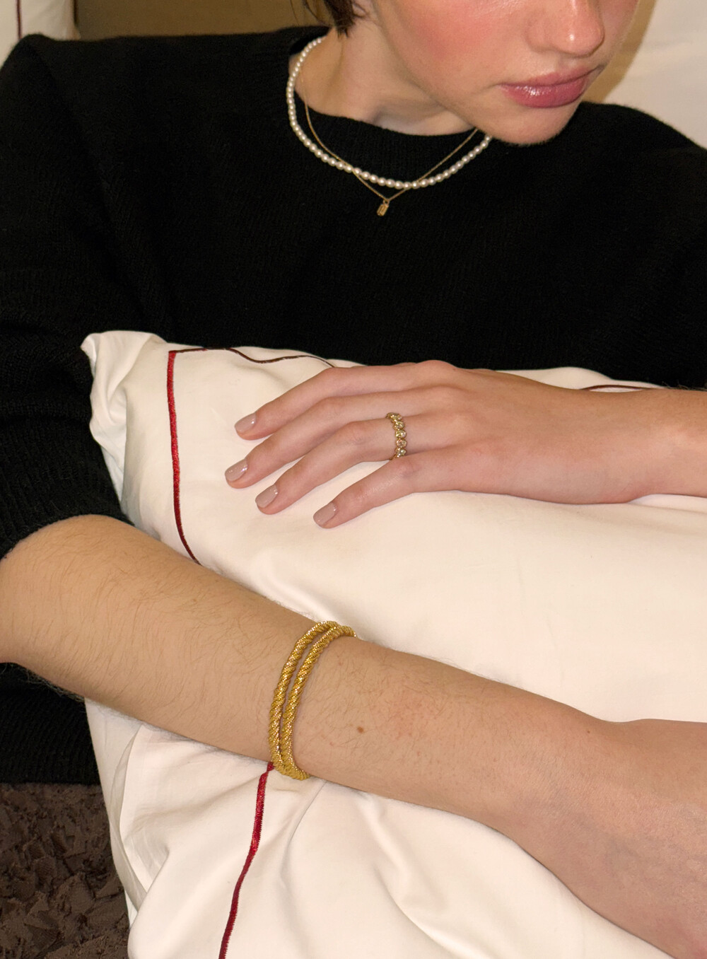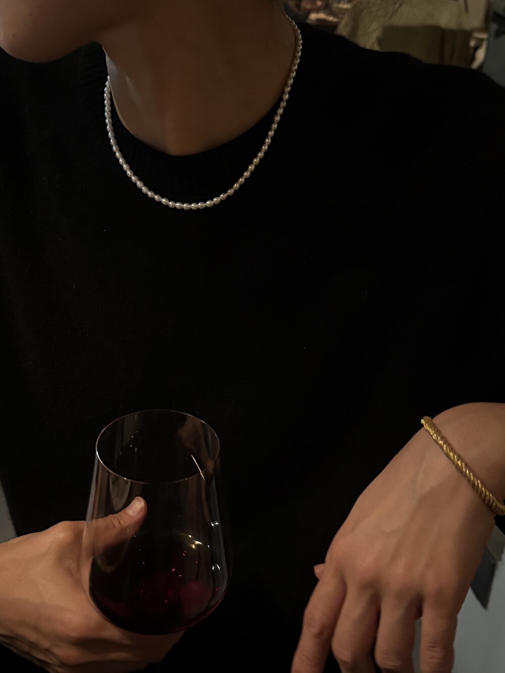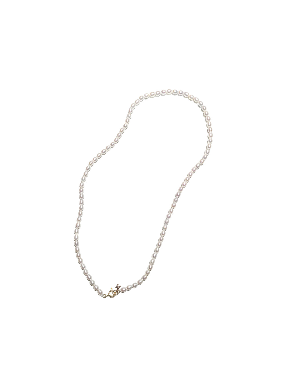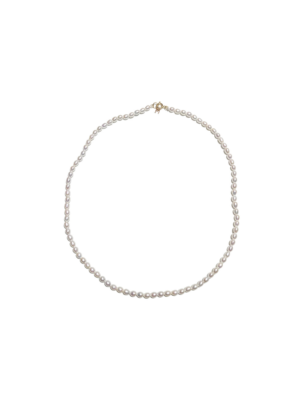 This 3.5mm freshwater pearl bead necklace gently wraps around the neckline. With a pearl size that is neither too small nor too large, it can be easily paired with any outfit while adding an elegant touch.