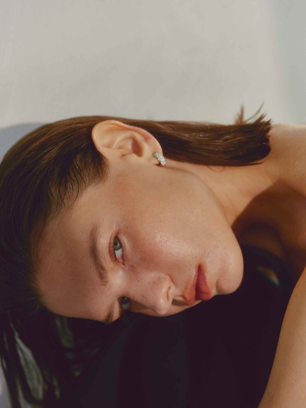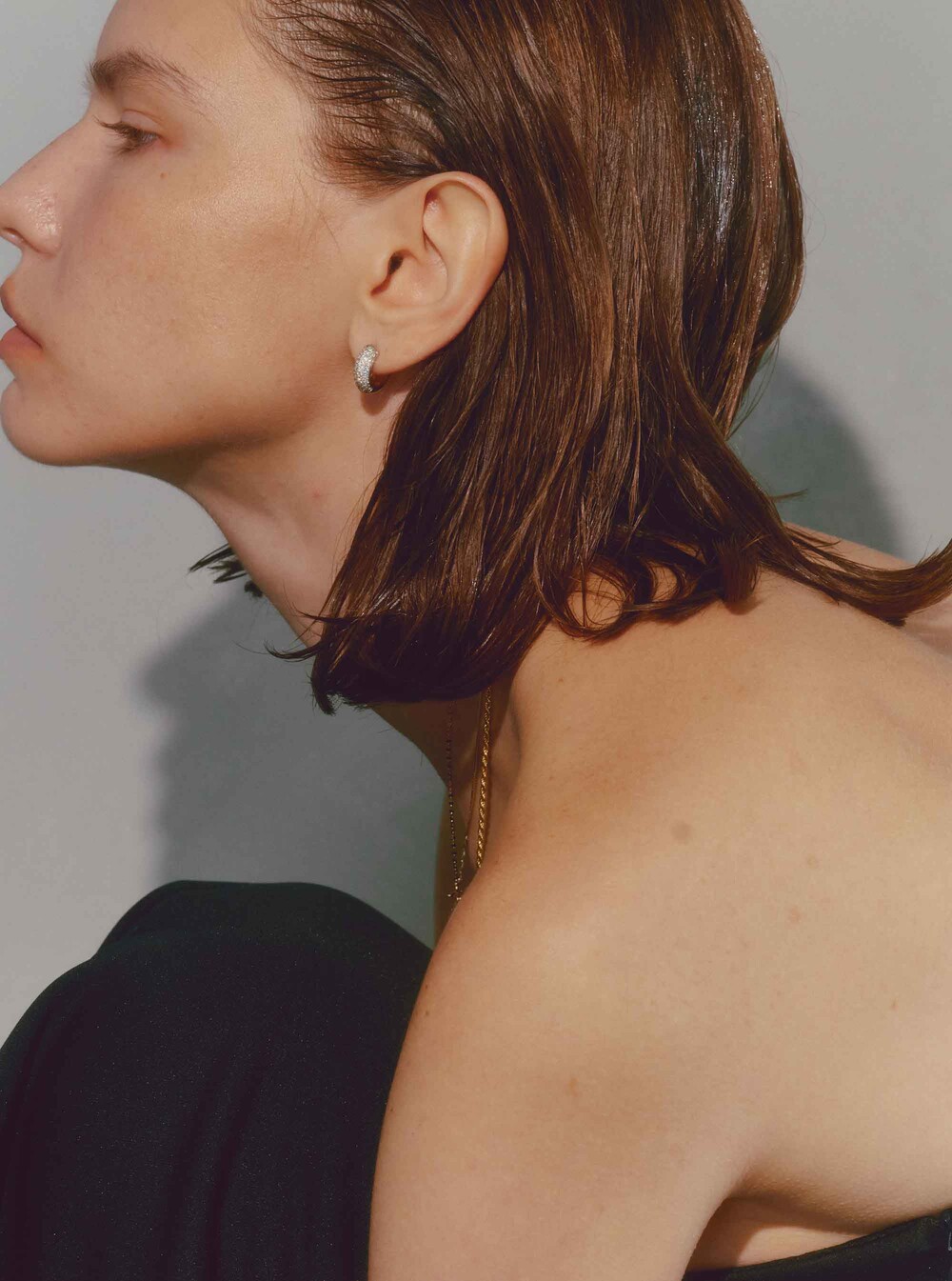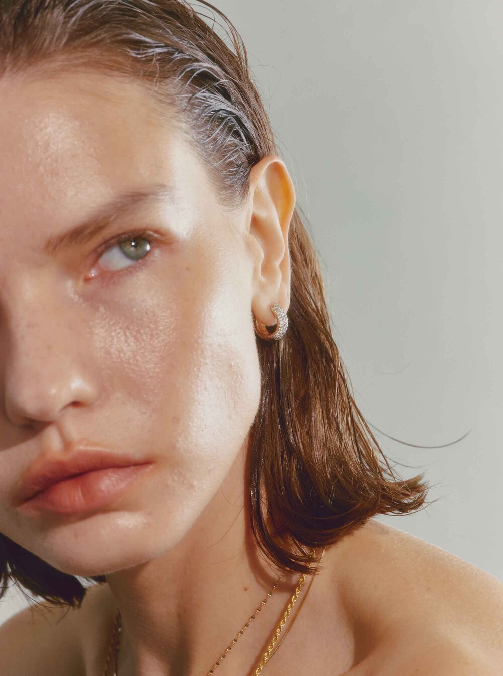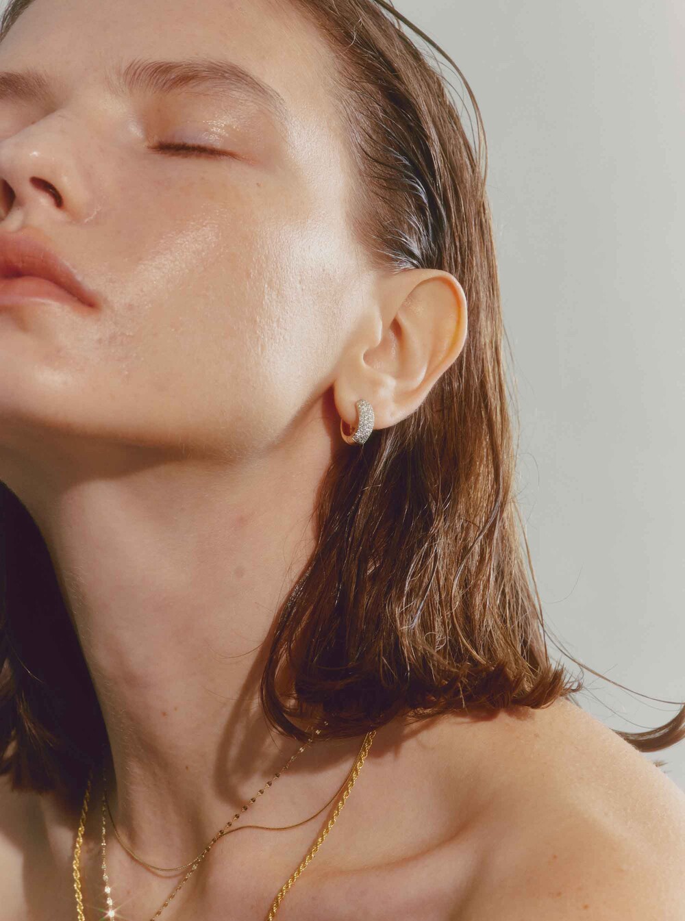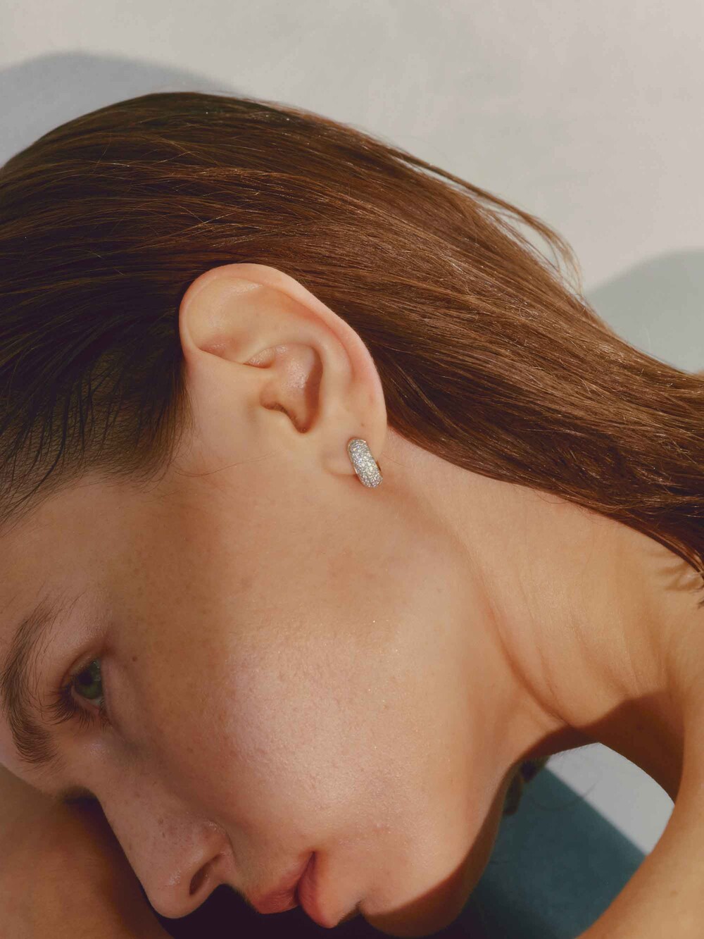 This earring has gemstones set in white gold on the front part, while the back ring part is made of yellow gold. With its voluminous design, it stands out when worn, making a statement.