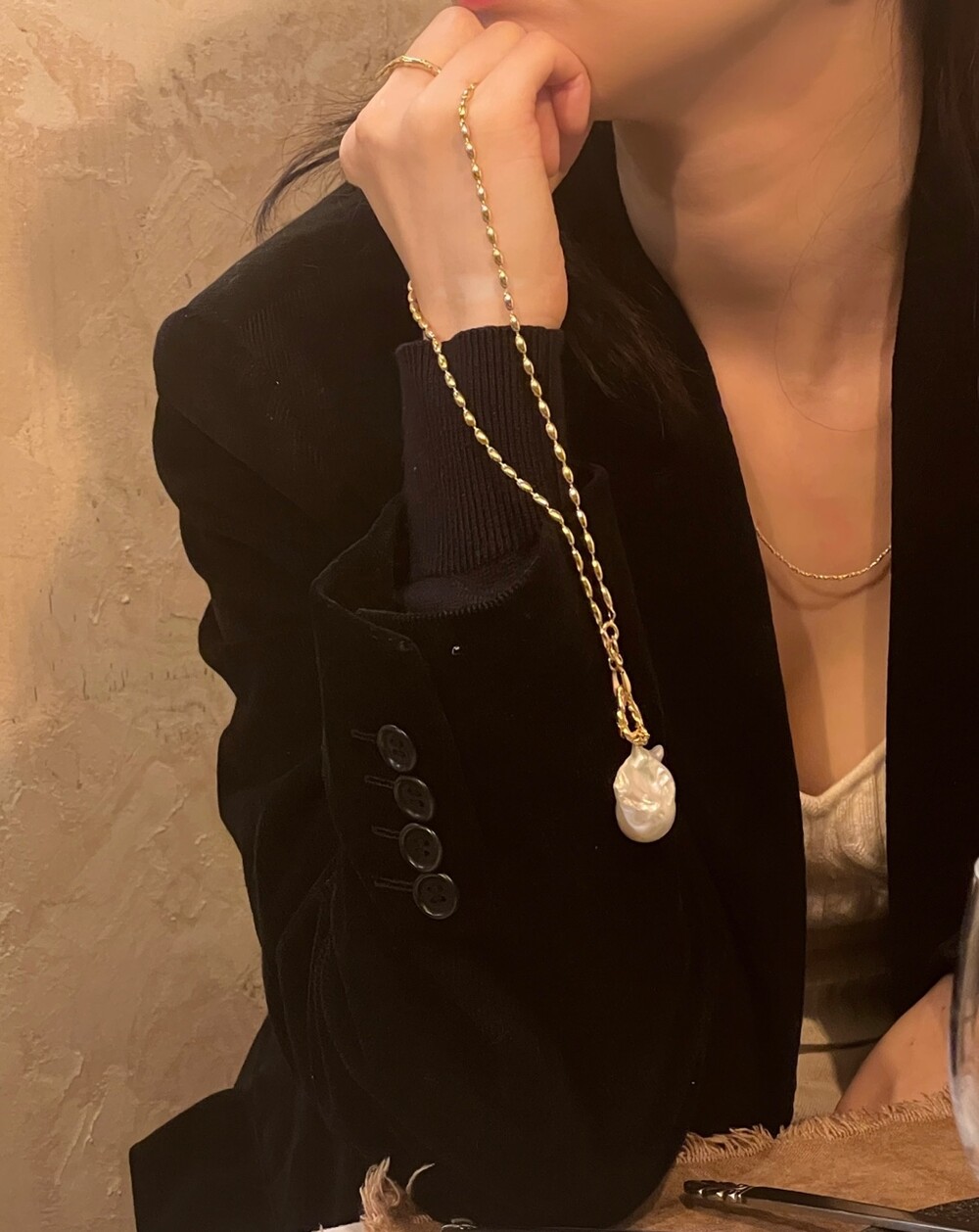 This necklace features stunning baroque pearls, adding a stylish touch with their irregular shapes. The larger size of the pearls enhances the overall look.