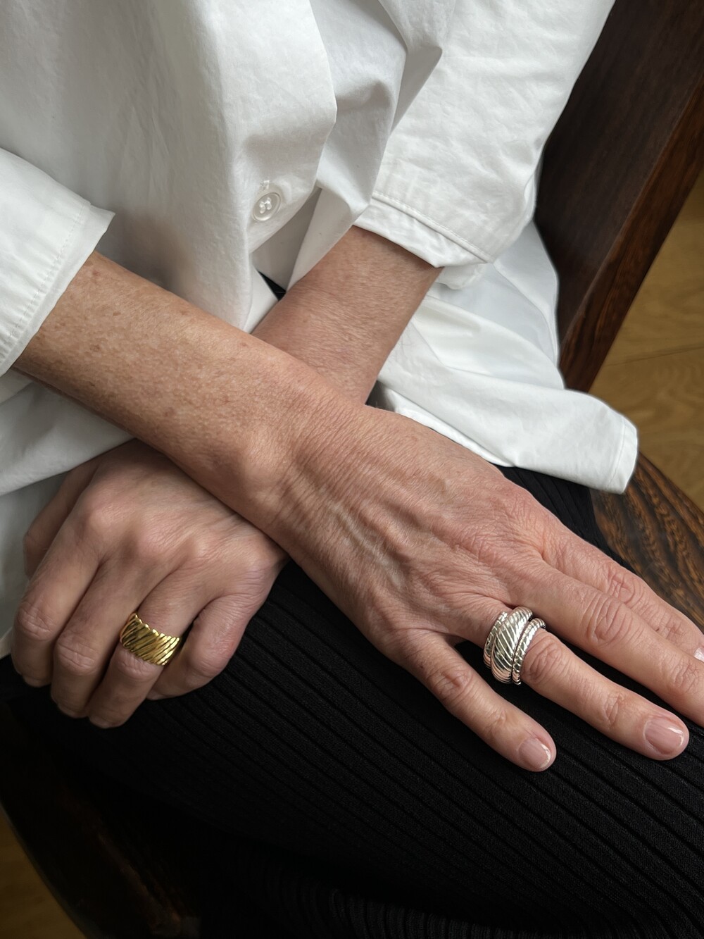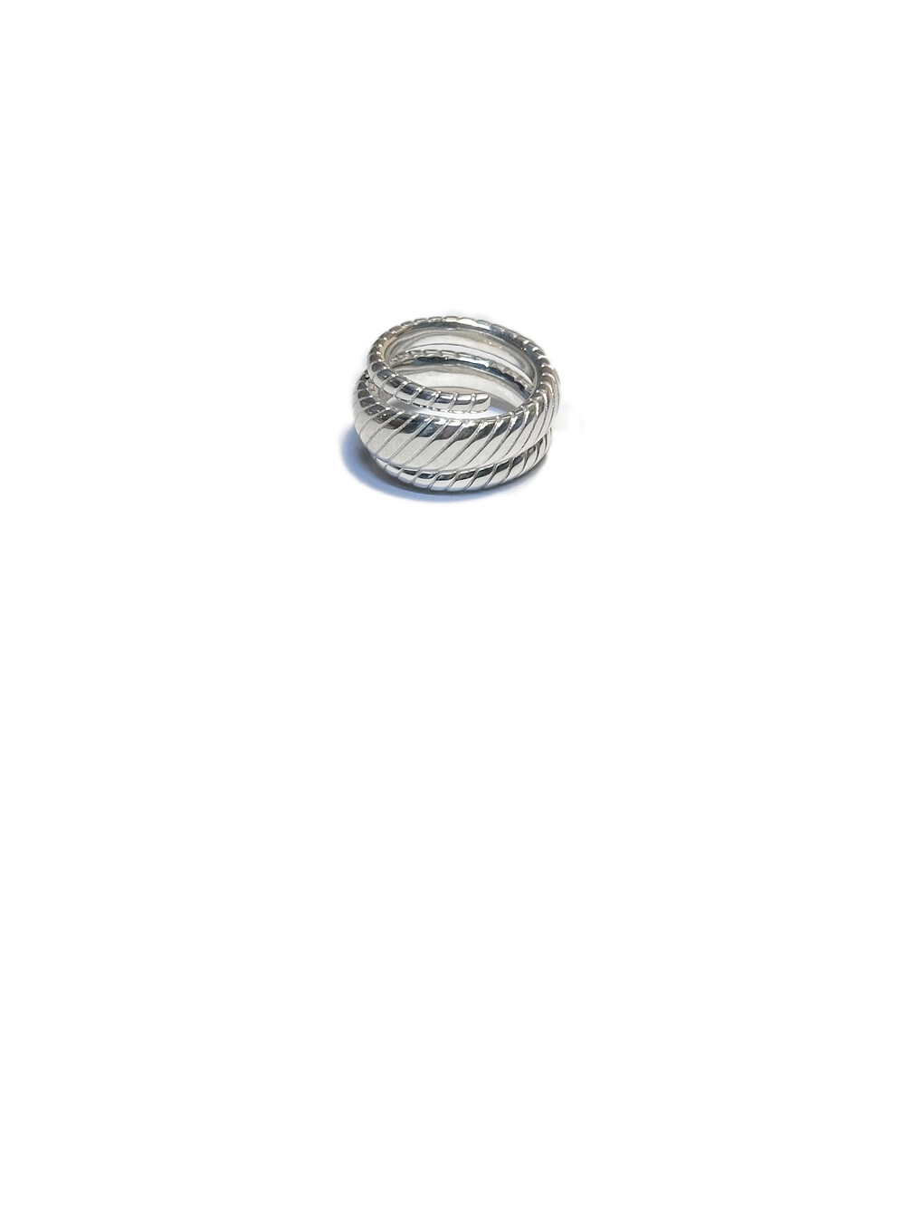 This product offers the sensation of wearing three interlocked rings, with the top appearing as three lines but thinning to two on the inner side for comfortable wear. Its bold silver design exudes a refreshing feeling. Suitable for both men and women, it's recommended for its versatile appeal.