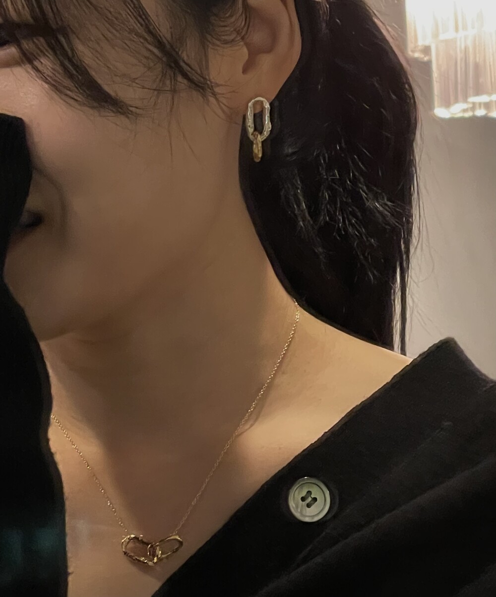 This earring features a chain-style design with two pieces connected to each other, and the dangling part below is gold-plated. It is recommended for daily wear due to its lightweight and comfortable size.