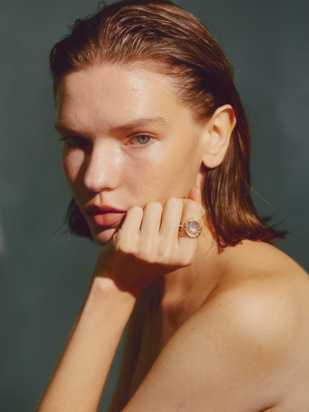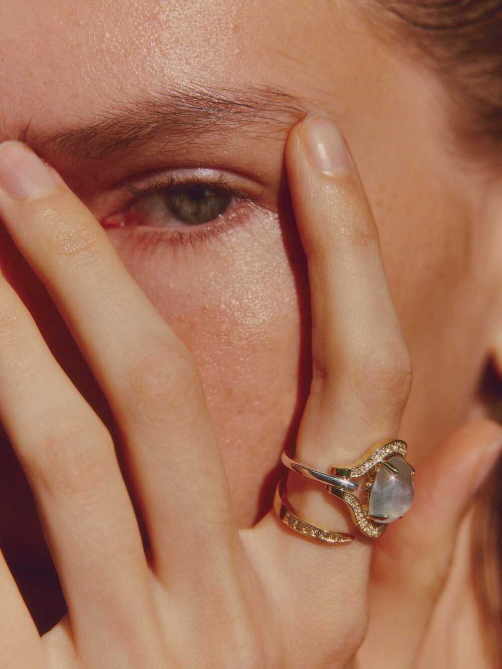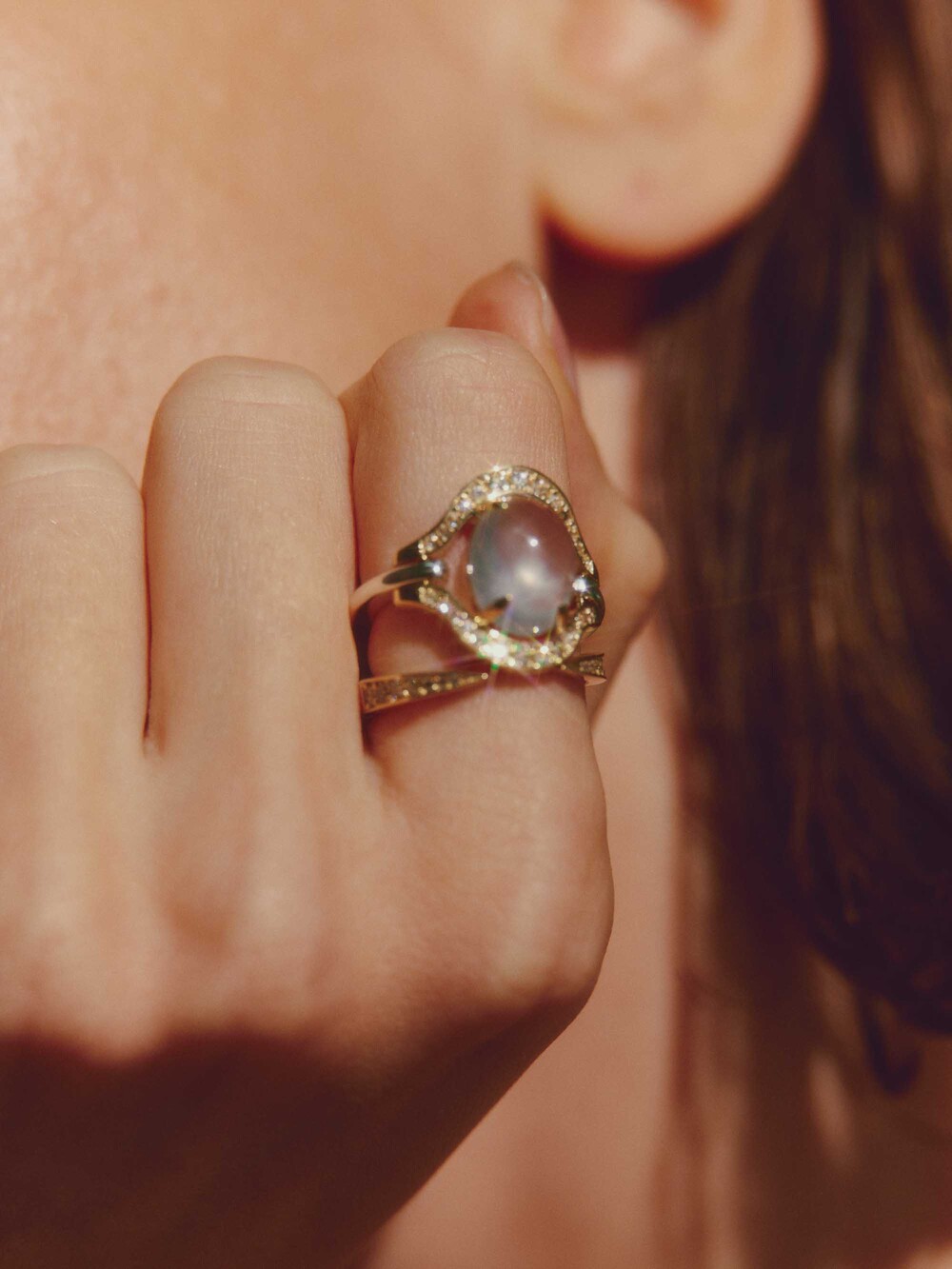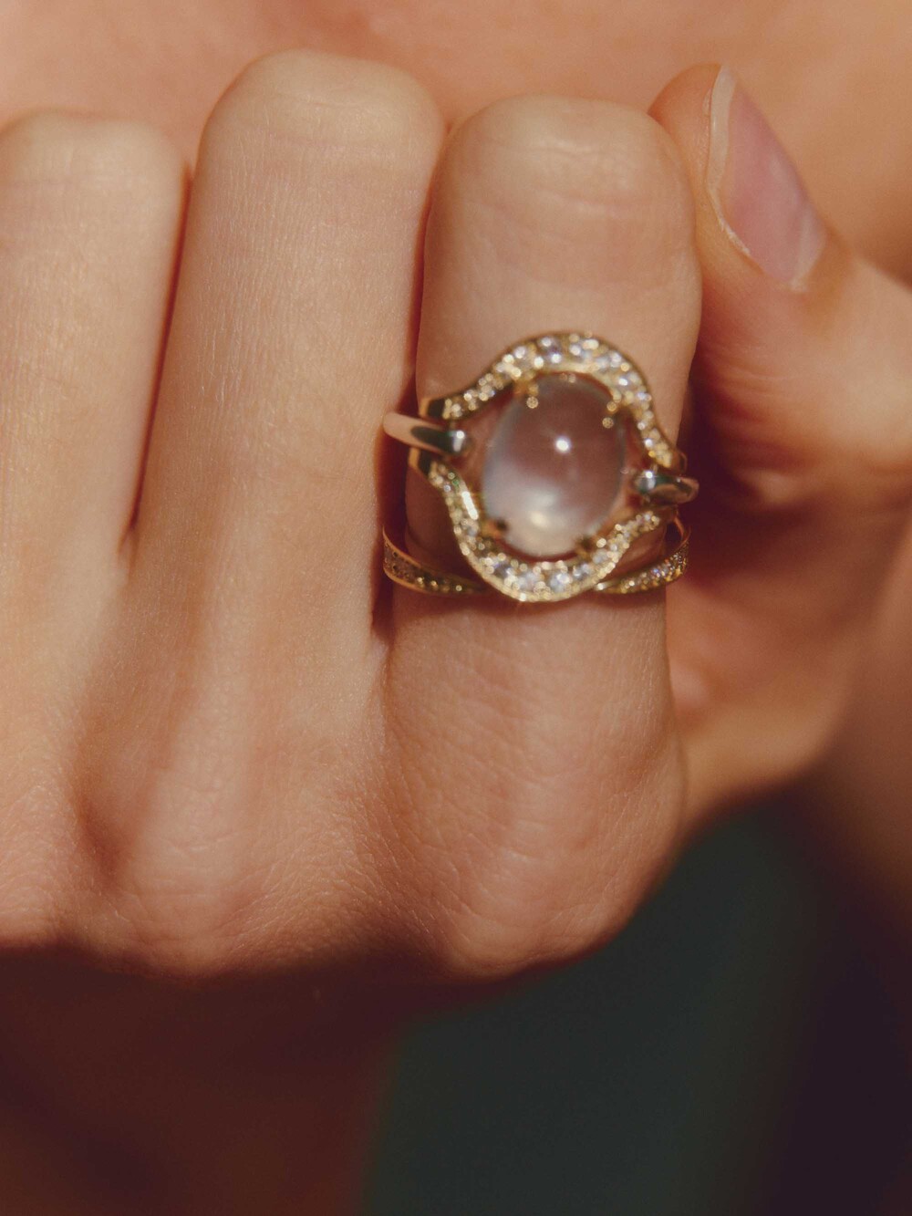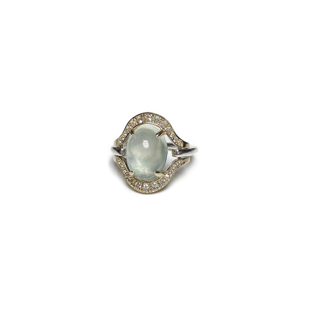 Stone : Cabochon prehnite and round white sapphires