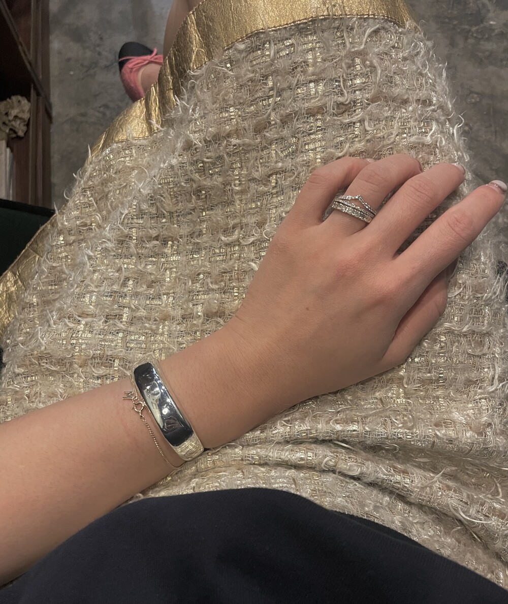 This eternity ring has 16 rough diamonds set around the ring. It is a natural gemstone, and slightly different colors give it a subtle feeling. Please note that there is a metal ingraving part without gemstones about 1cm.