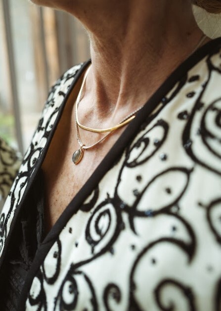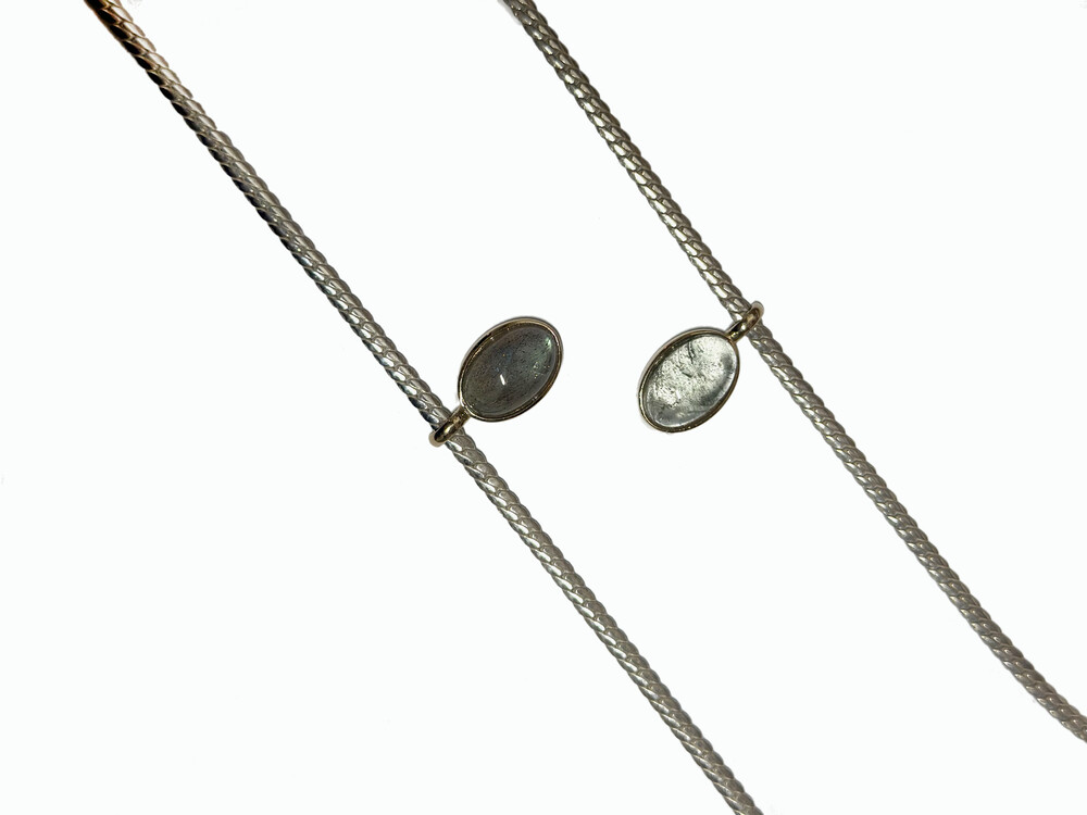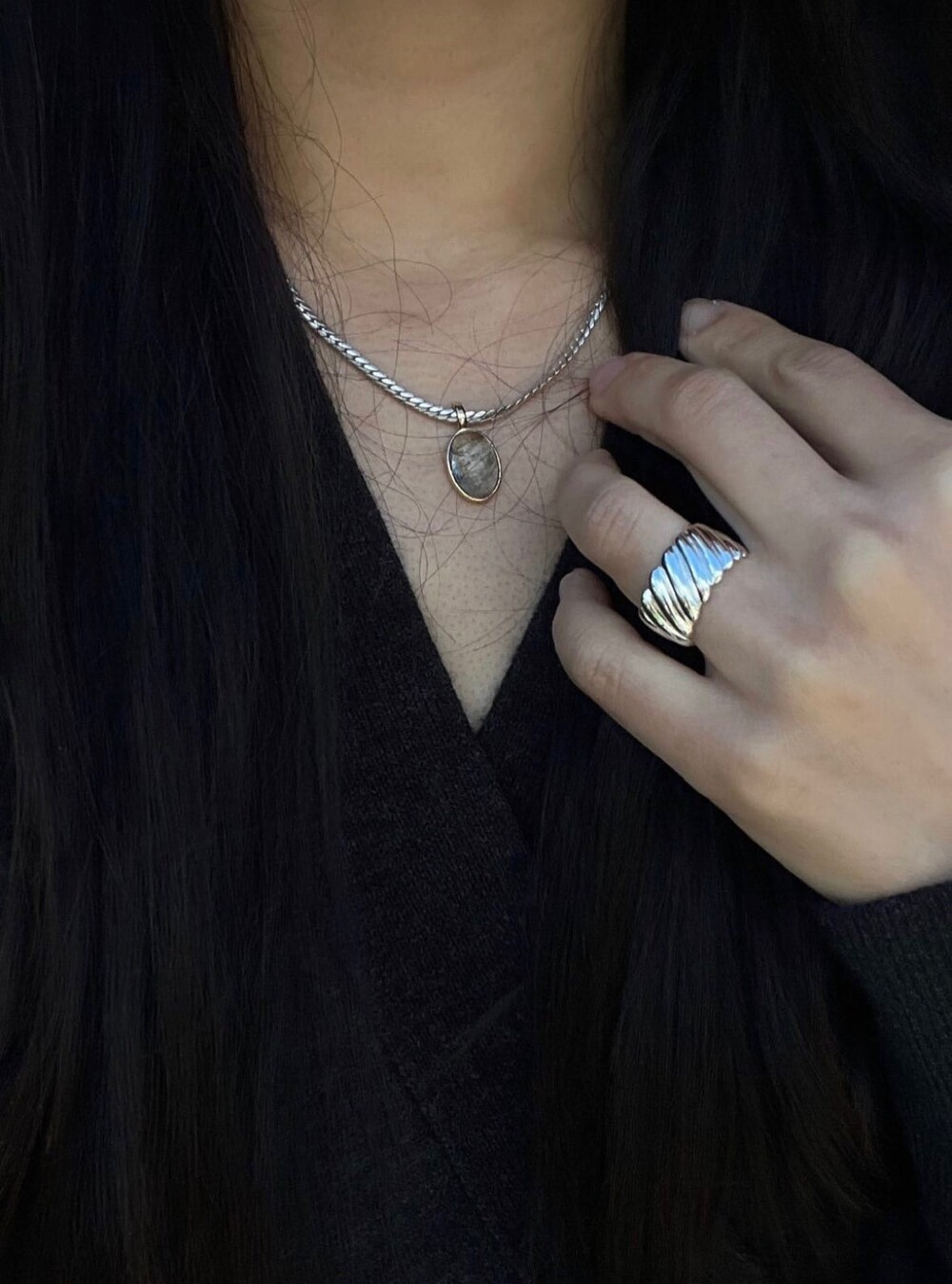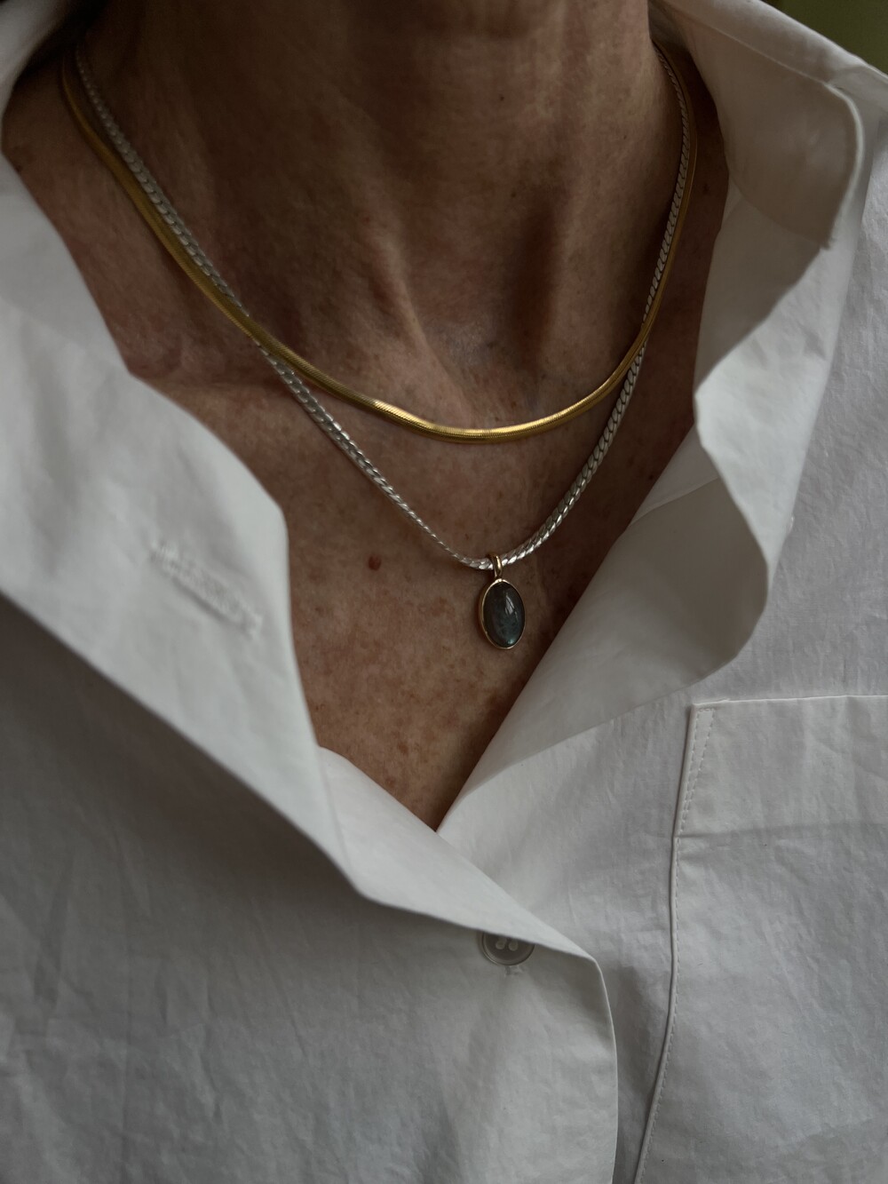 This necklace features a rough snake-like texture silver chain and a 14K gold pendant set with a gemstone resembling deep eyes of words.