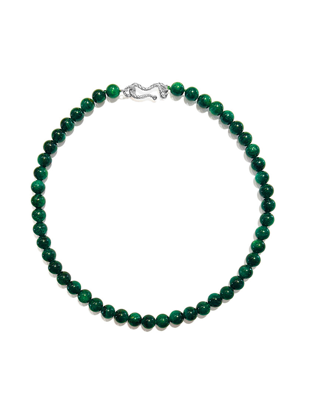 A bead necklace featuring captivating green-toned emeralds, gracefully strung together for a refined look.