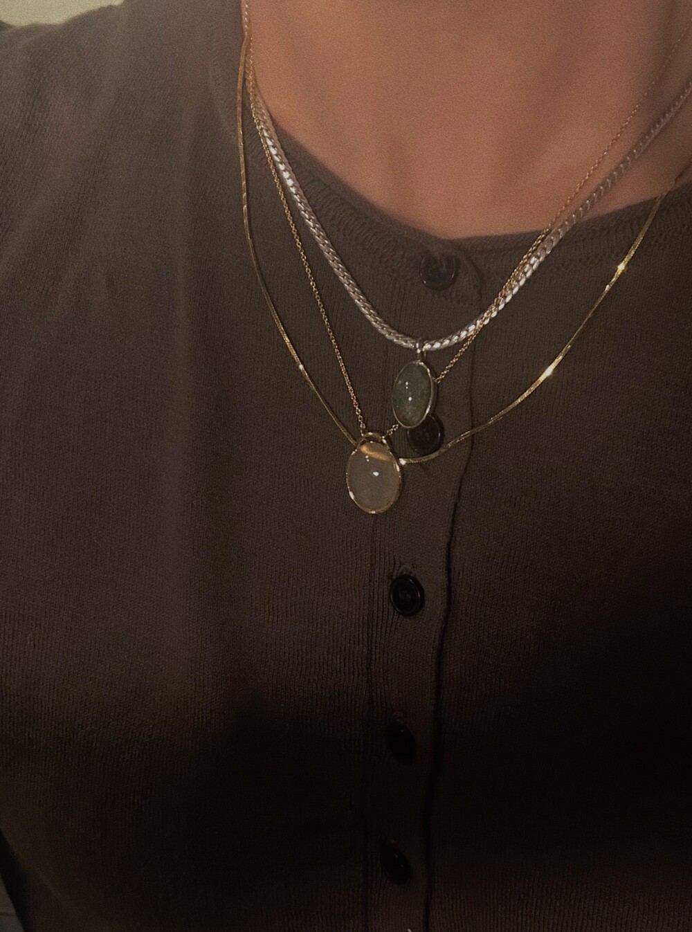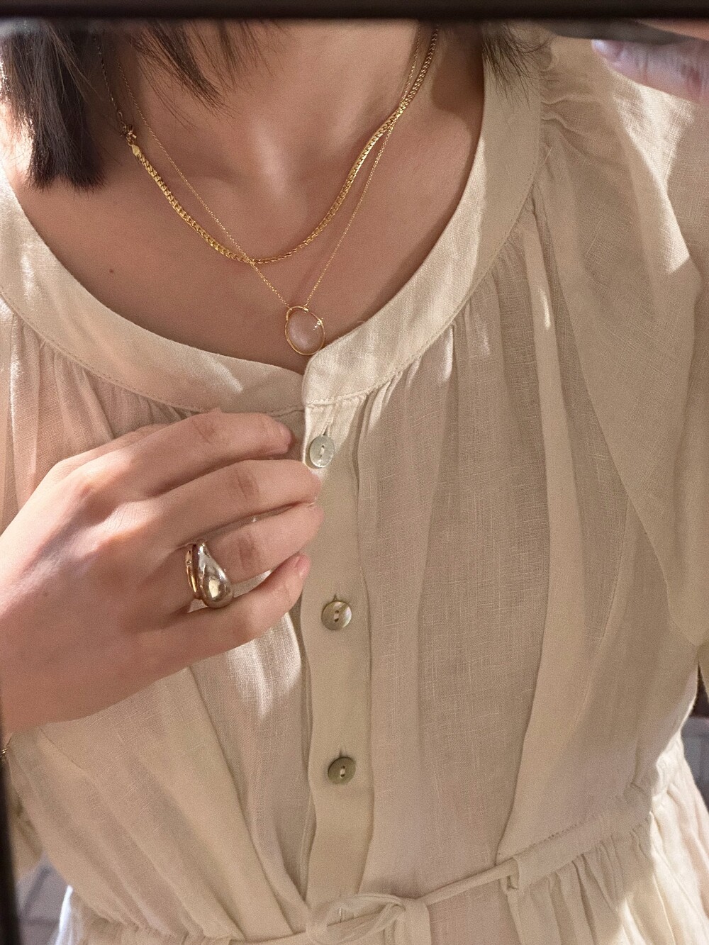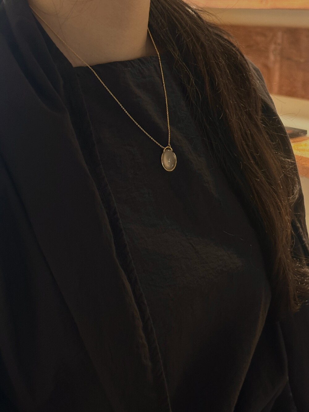 Featuring the soft allure of semi translucent rose quartz, the necklace is designed with a seamlessly connected pendant and chain. Despite being a single structure, the pendant moves freely with motion, adding a graceful and delicate touch.