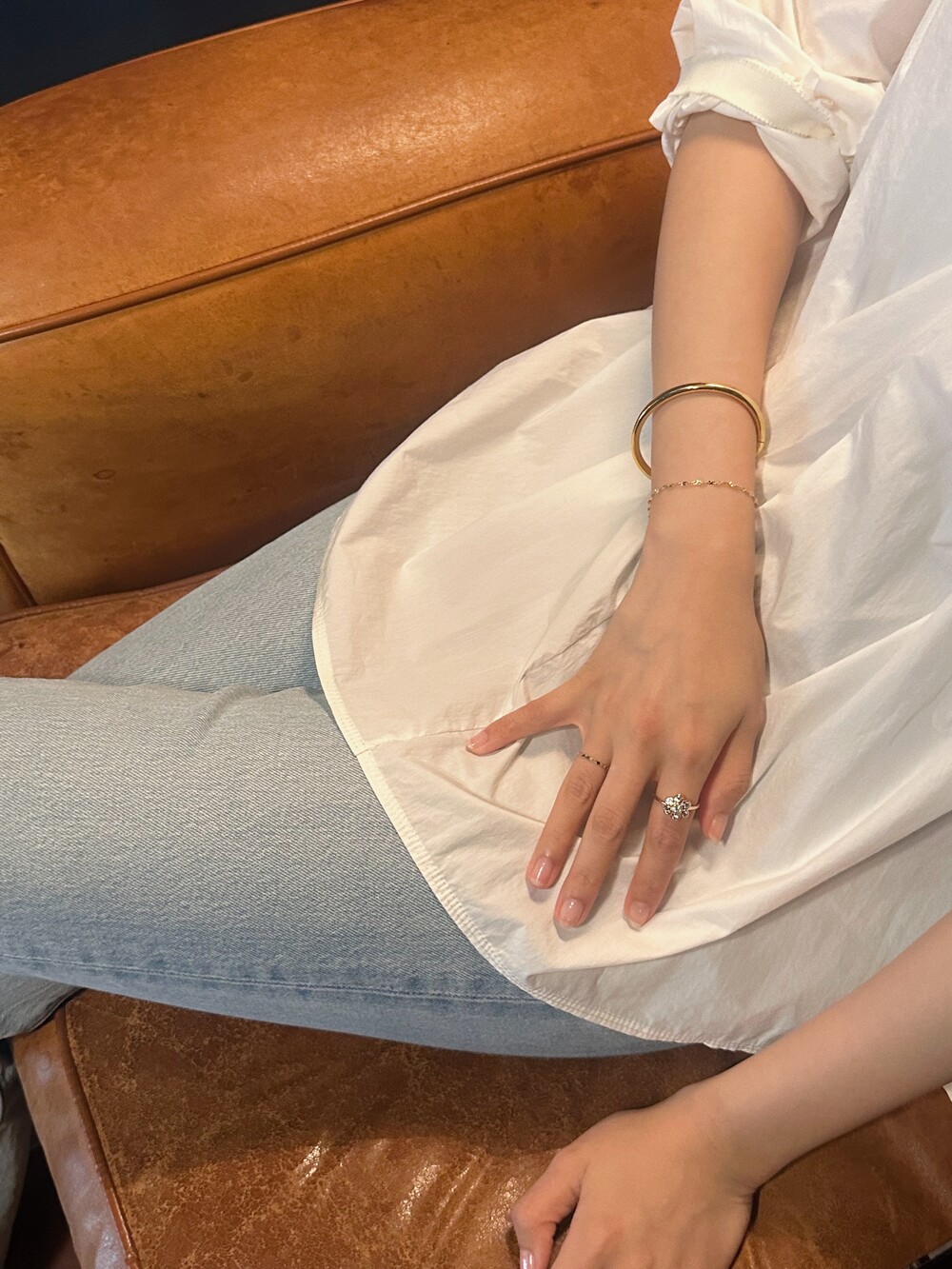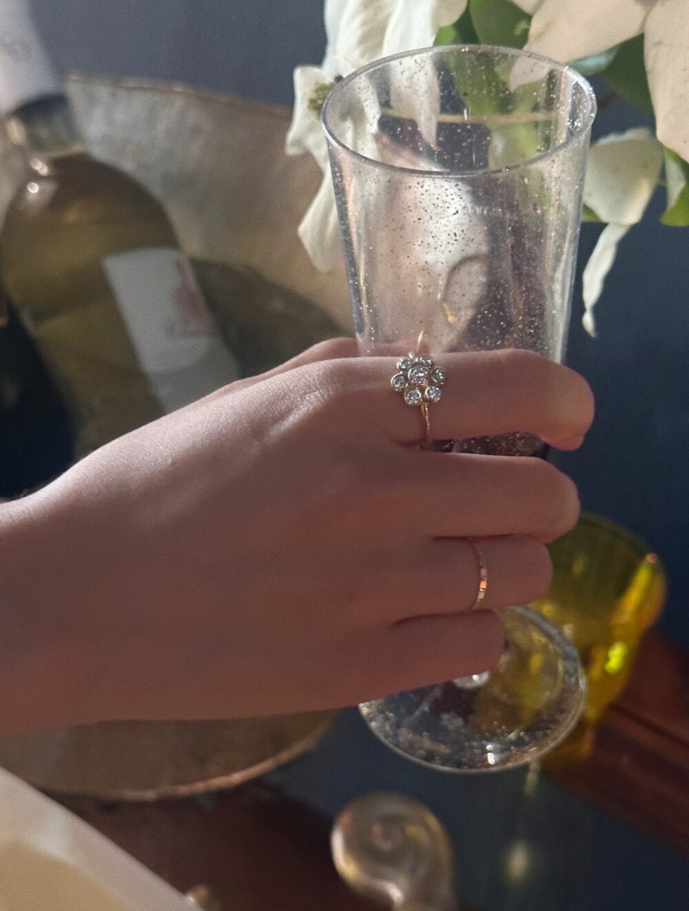 A flower ring crafted in 14K gold, delicately set with lab-grown diamonds that bloom like radiant petals. The warm gold and sparkling diamonds create a harmonious glow, luminous on its own and even more captivating when layered.