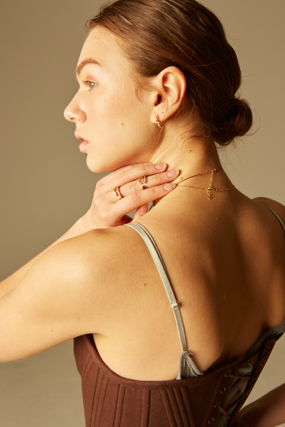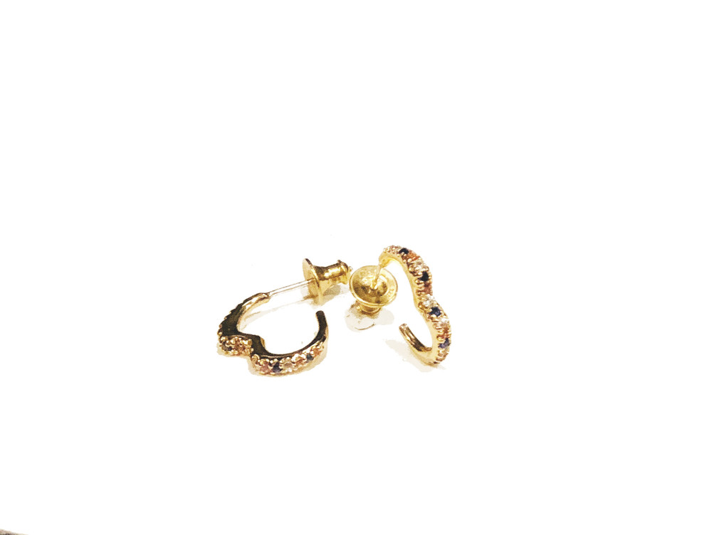 The Amour Collection features earrings where the heart shape is laid horizontally, appearing like small rings but revealing a heart shape naturally. For those who prefer small earrings for daily wear, these earrings are perfect, with small orange, blue, and white sapphires set in them.