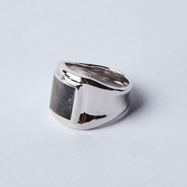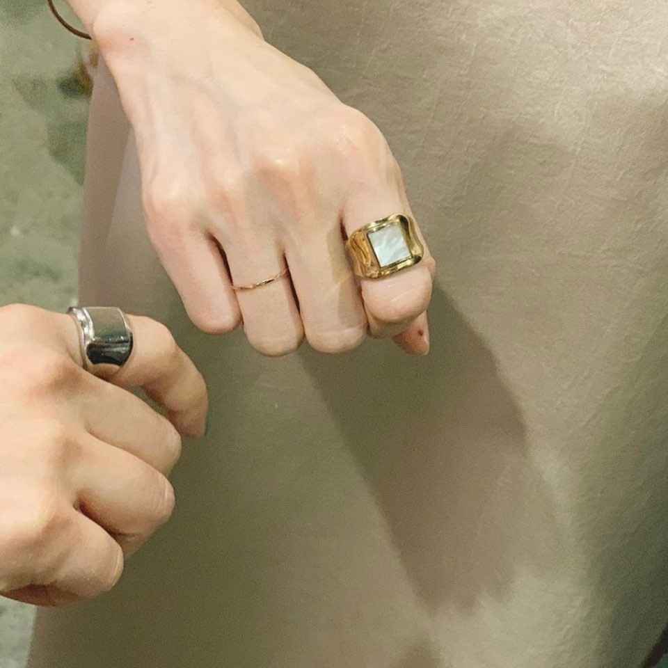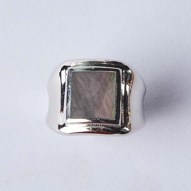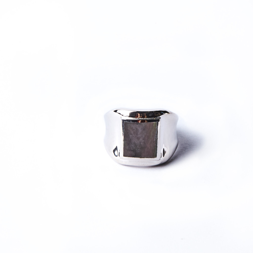 This is a ring with contrasting charms of black mother of pearl and white mother of pearl. This bold ring is perfect to wear with a boxy shirt or dress.