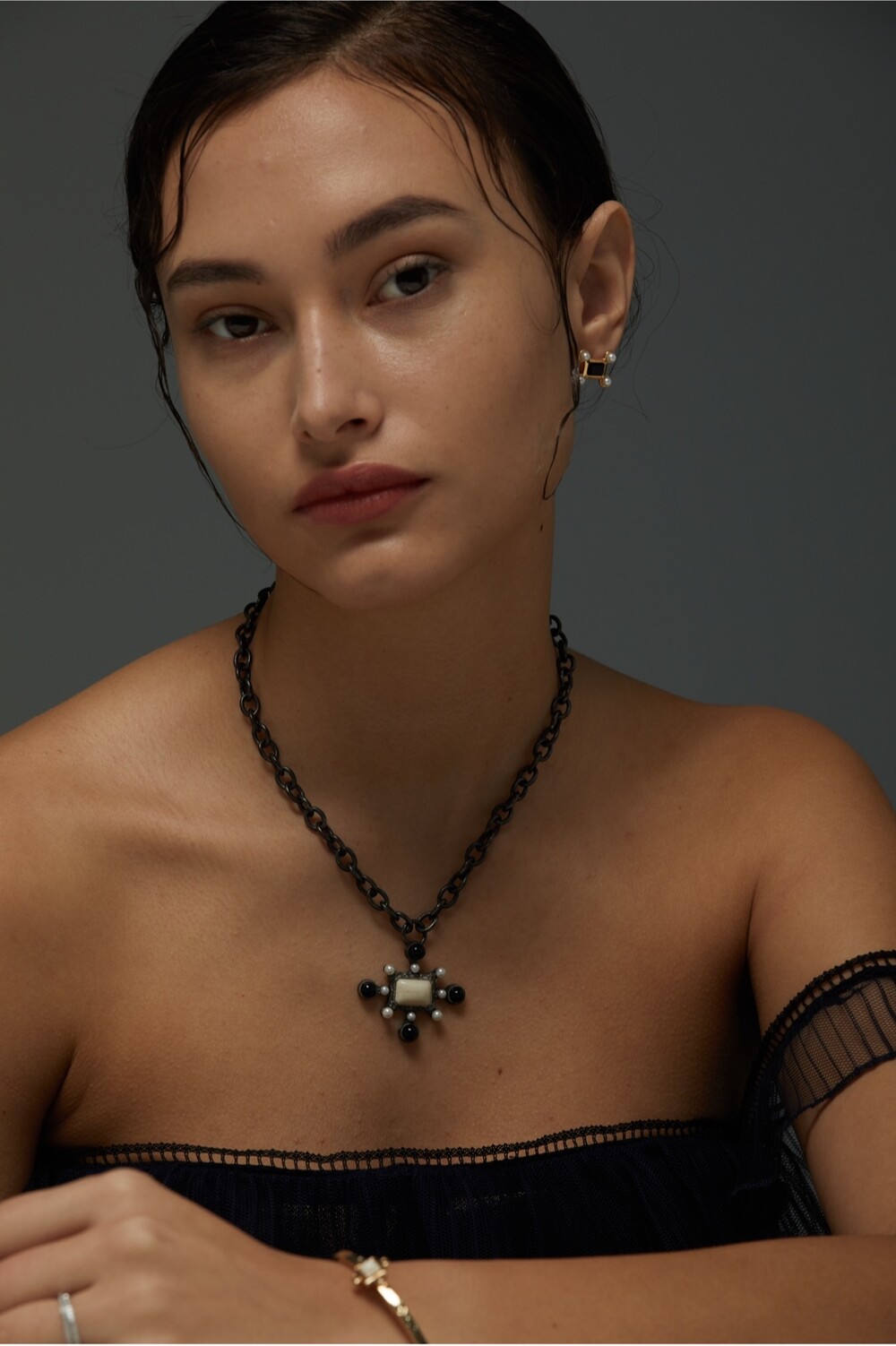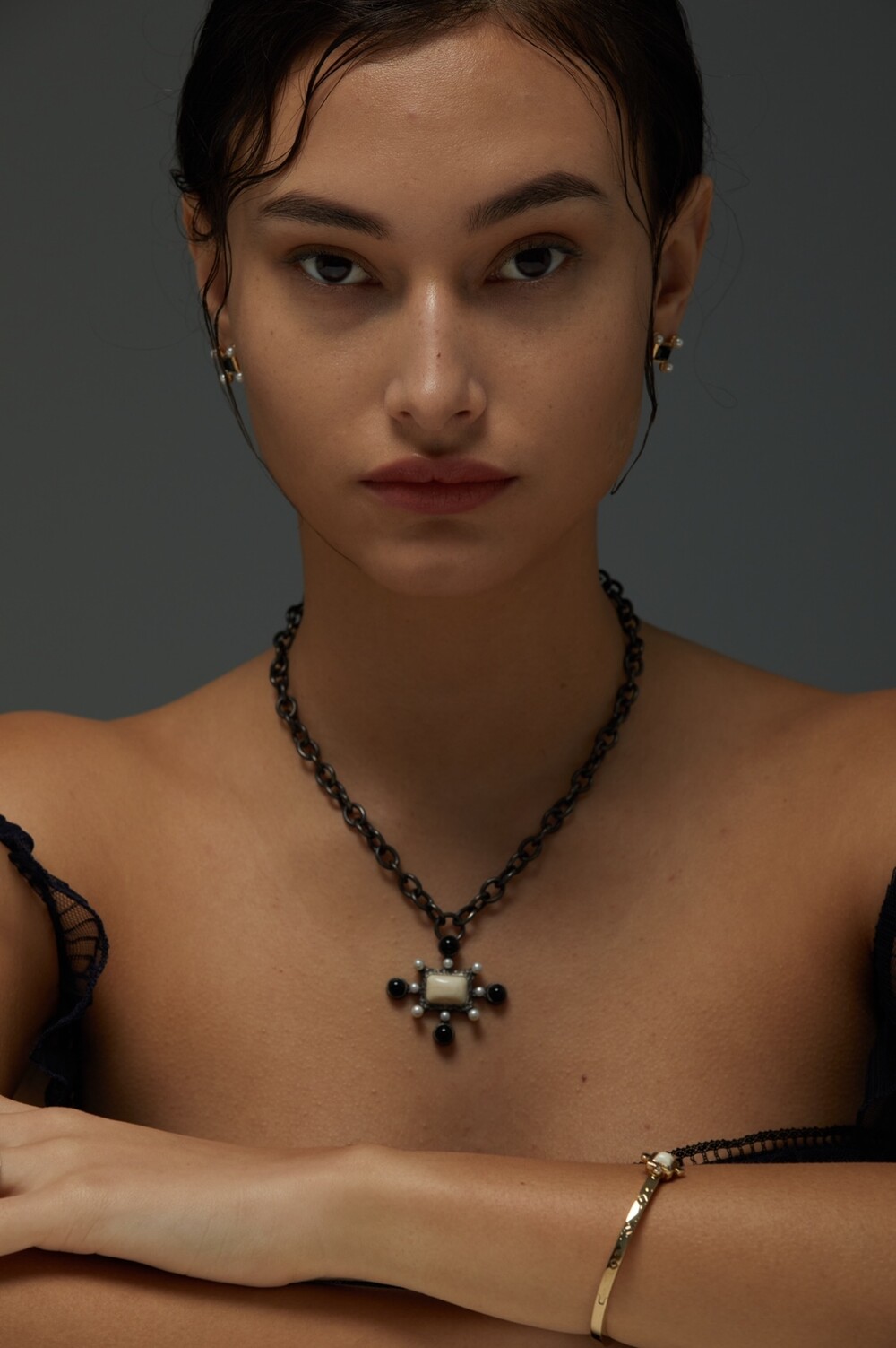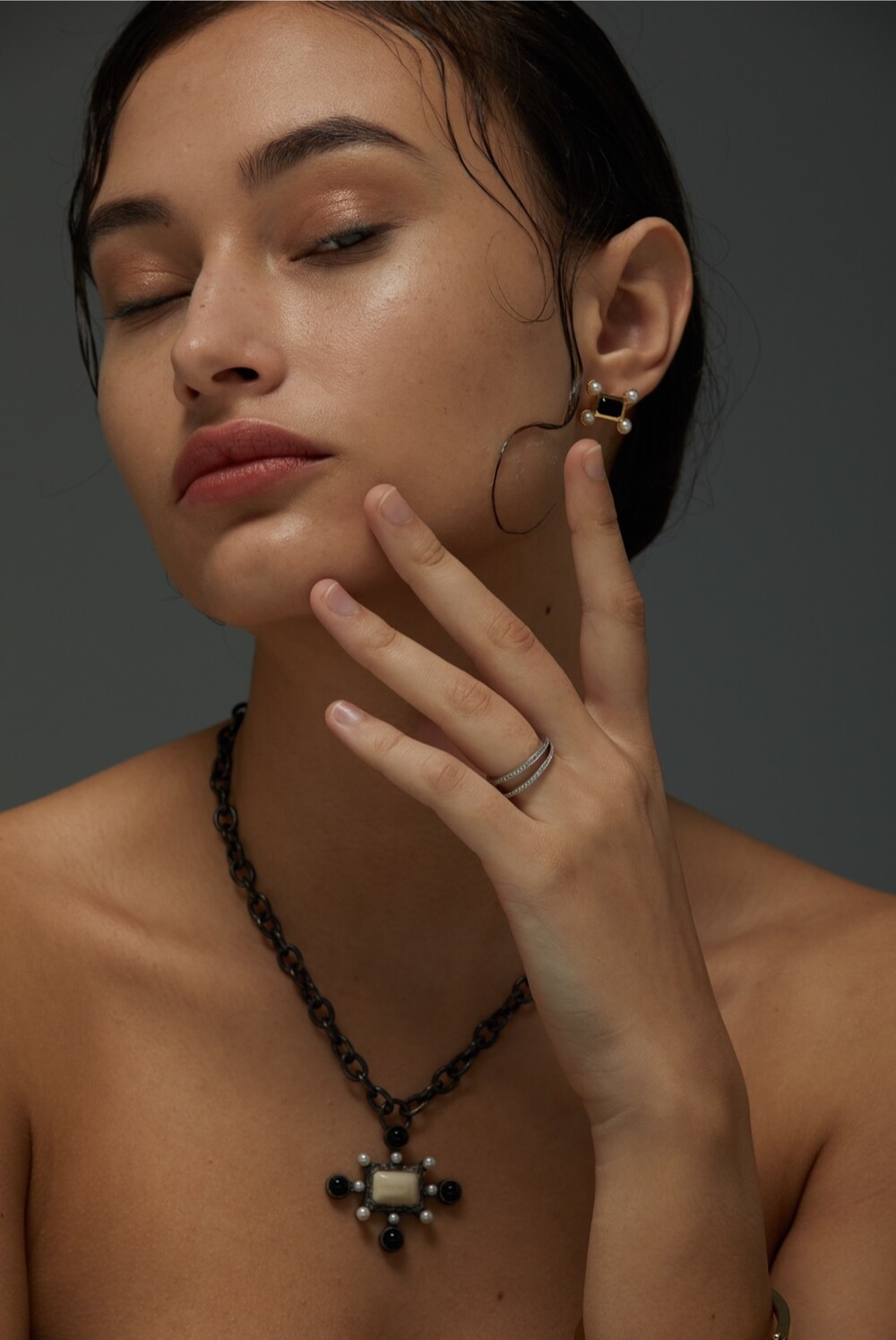 These earrings feature a structural design with a modern feel, contrasting the colors of Black Onyx and Natural Freshwater Pearls.Inspired by the geometric motifs of the 1920s Art Deco era, they are characterized by their color contrast and unique design.